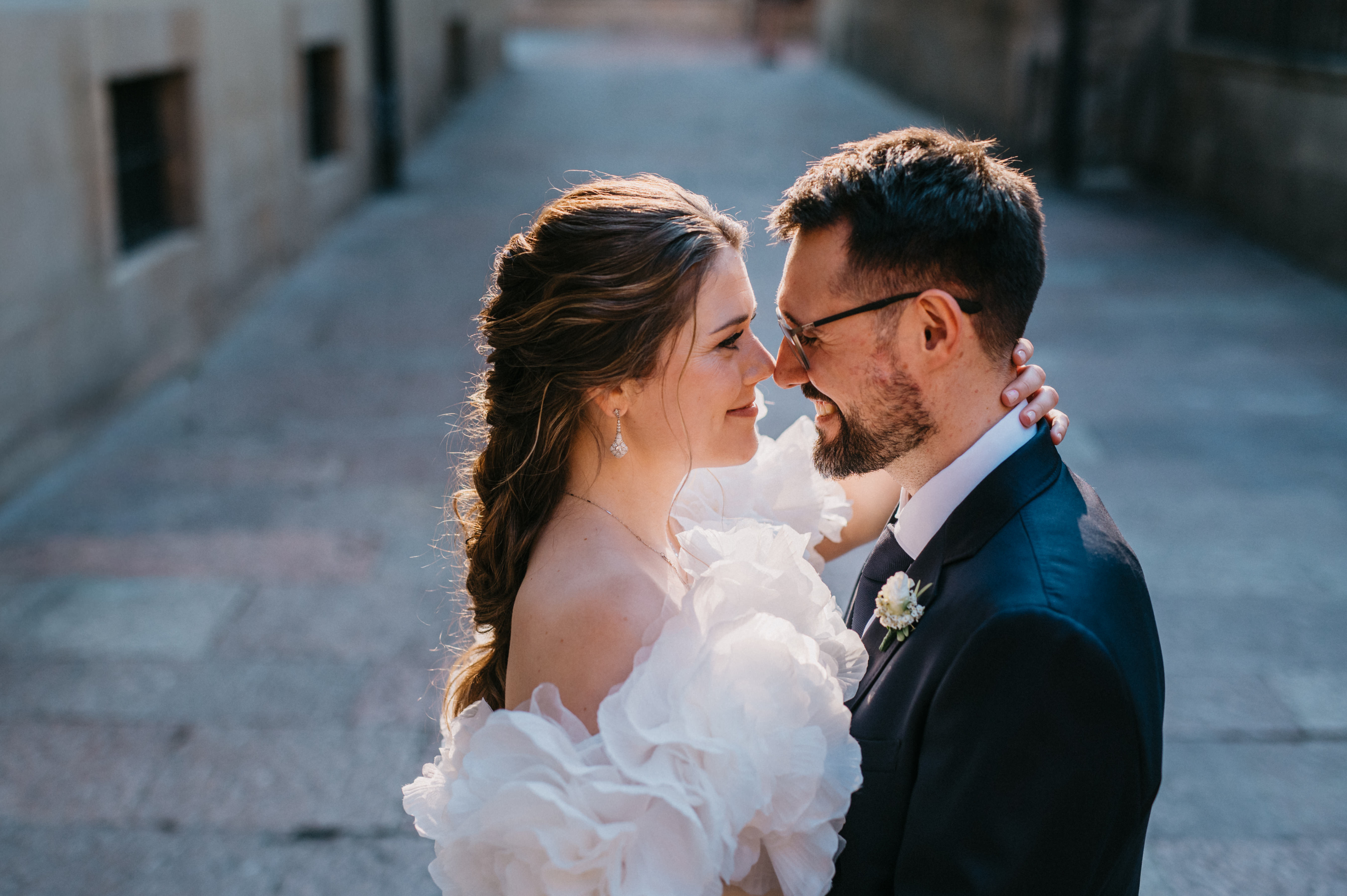 Después de la ceremonia, recorrimos juntos las calles de Oviedo, buscando rincones tranquilos donde dejarles ser como son para tener una sesión en pareja de lo más especial. Y es que la luz que nos acompañó fue el ingrediente perfecto para dar rienda suelta a la creatividad y disfrutar de esos momentos con ellos, casi a solas, antes de lo que iba a venir a continuación.